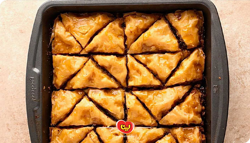 بلافاصله پس از خارج کردن باقلوا از فر، شربت خنک را به صورت یکنواخت روی تمام سطح باقلوا ریخته و پخش میکنیم. اجازه میدهیم باقلوا به مدت چند ساعت استراحت کند تا شربت کاملا جذب شود.