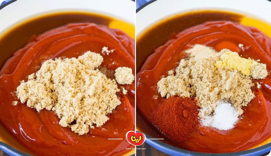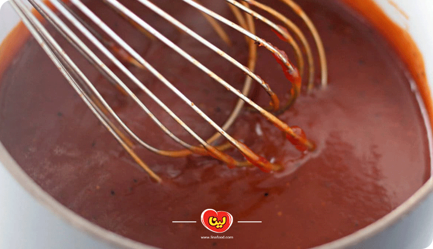 برای شروع کار، رب گوجه فرنگی را به همراه شکر، آبلیمو ترش، روغن مایع و سرکه سفید در یک قابلمه کوچک ریخته و روی حرارت متوسط قرار میدهیم. حدود ۵ دقیقه مواد را به آرامی تفت میدهیم تا به خوبی ترکیب شده و طعم خامی رب گرفته شود.