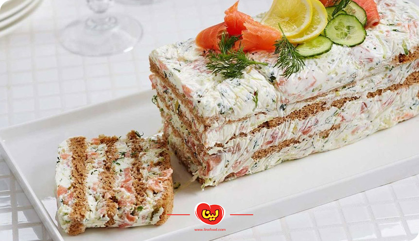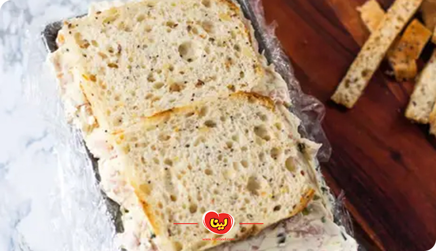 در این مرحله، نان تست را در ظرف شیشهای یا قالب مستطیل شکل میچینیم. سپس روی آن را با ترکیب پنیر و خامه میپوشانیم و مقداری سبزی و گردوی خشک شده روی آن میریزیم. در ادامه لایه دیگری از نان تست روی آن قرار داده و مراحل قبل را تکرار میکنیم تا جایی که ظرف پر شود.