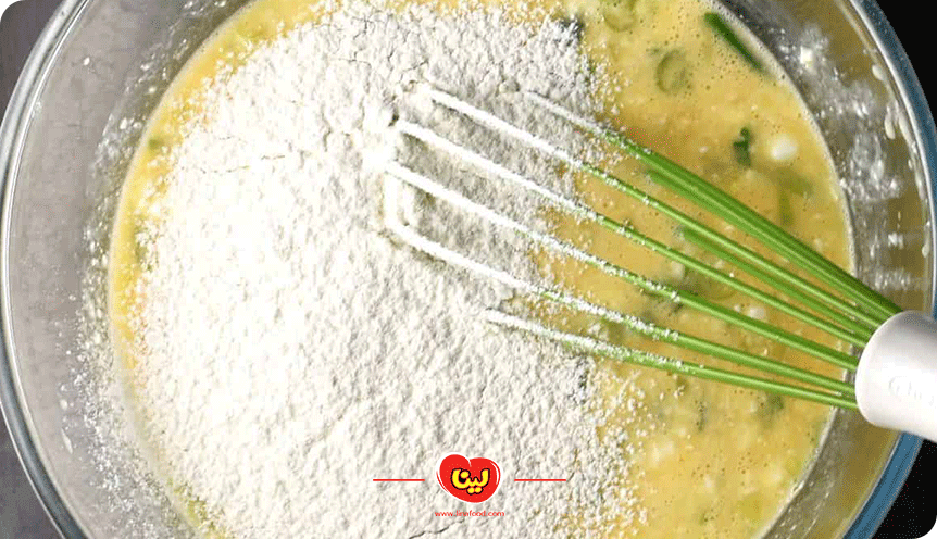 در این مرحله، بکینگ پودر و آرد را به مخلوط مواد اضافه کرده و مانند تهیه نان بازلاما مجددا به هم زدن ادامه میدهیم تا خمیر یکدستی حاصل شود.