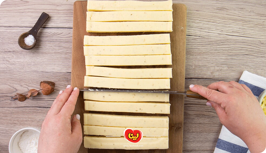 خمیر آماده شده را با استفاده از وردنه روی سطح آردپاشی شده پهن میکنیم. سپس مانند تهیه چیپس ترکیهای با استفاده از چاقوی تیز، خمیر را به صورت مستطیلهای دراز برش میزنیم.