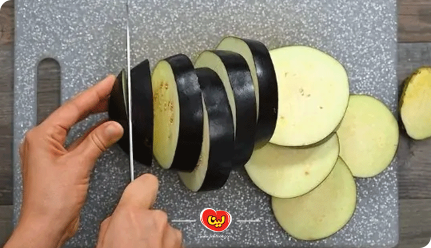 بادمجانها را شسته و به خوبی خشک میکنیم. سپس مانند تهیه اردور بادمجان، آنها را به صورت ورقههای پهن با ضخامت ۴ الی ۵ سانتی متر برش میزنیم.