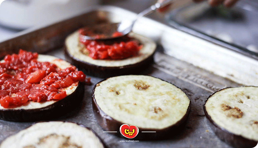 کف سینی فر را با کاغذ روغنی میپوشانیم. ورقهای بادمجان را با فاصله روی آن میچینیم و روی آنها را به روغن زیتون به خوبی آغشته میکنیم.