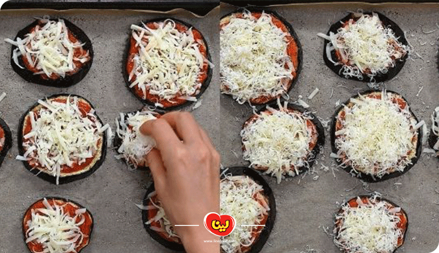 در مرحله آخر وقتی همه مواد را اضافه کردیم، مانند تهیه اسنک بادمجان روی هر لقمه بادمجان را با پنیر موزارلای رنده شده به خوبی میپوشانیم.