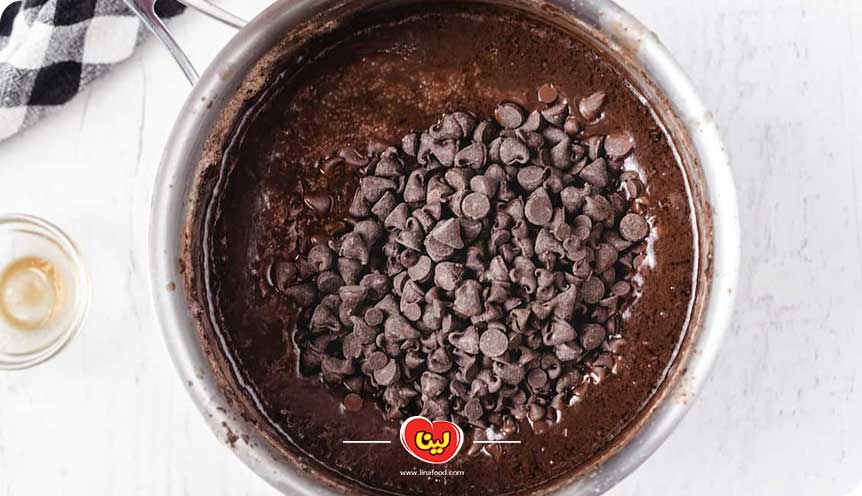 پس از ترکیب مواد خشک و تر با هم، شکلات چیپسی را به قابلمه اضافه کرده و با حرارت ملایم، مواد را هم میزنیم تا شکلات کاملا ذوب شود و مواد کاملا به خورد هم روند.