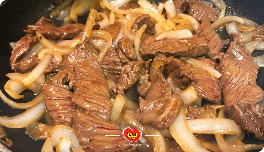 مرحله دوم؛ تفت دادن پیاز و گوشت