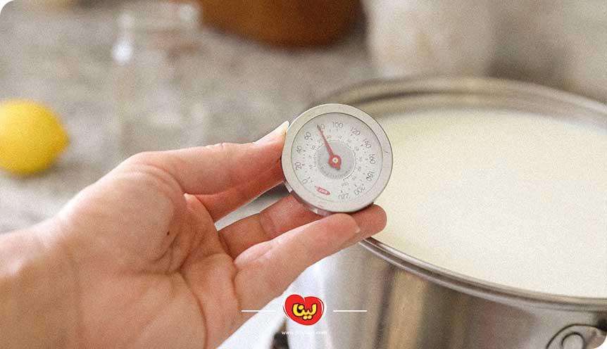 ابتدا شیر تازه را در یک قابلمه بزرگ ریخته و روی حرارت ملایم قرار دهید. برای اطمینان از حذف میکروبها، شیر را تا نقطه جوش برسانید و اجازه دهید حدود ۵ دقیقه بجوشد. سپس شعله را خاموش کنید و صبر کنید تا دمای شیر کمی کاهش یابد (حدود ۴۰ درجه سانتیگراد).