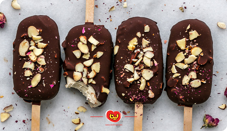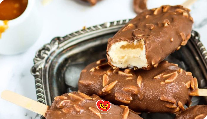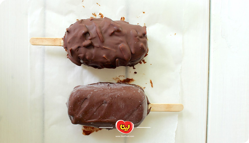 پس از اینکه بستنیها کاملا یخ زدند، هر کدام را از قالب خارج کرده و درون ترکیب شکلات فرو میبریم و میچرخانیم تا همه قسمتهای بستنی با شکلات پوشیده شود.