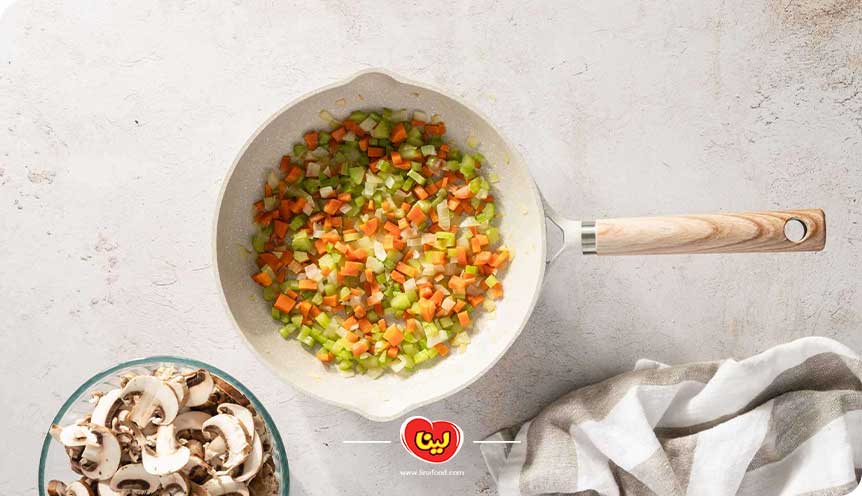 کره را در قابلمه مناسبی ریخته و مانند تهیه تارت کدو سبز روی حرارت قرار میدهیم تا ذوب شود. سپس پیازچه و هویج خرد شده را به تابه اضافه کرده و کمی تفت میدهیم تا هویجها نرم شود. در ادامه قارچهای خرد شده را اضافه کرده و حدود ۱۰ دقیقه با حرارت ملایم تفت میدهیم تا قارچها آب خود را پس داده و کمی طلایی شوند.