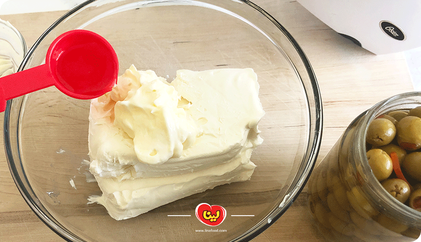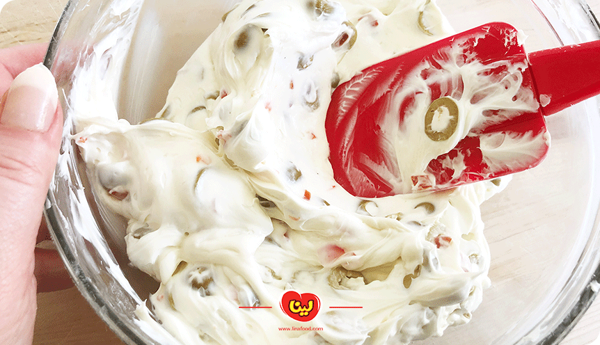 در یک کاسه مجزا، پنیر خامهای را به همراه خامه صبحانه، روغن زیتون و آبلیمو اضافه میکنیم. سپس مواد را به خوبی هم میزنیم تا ترکیب یکدستی حاصل شود.