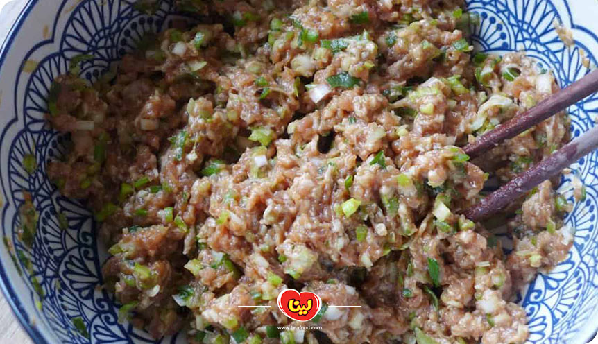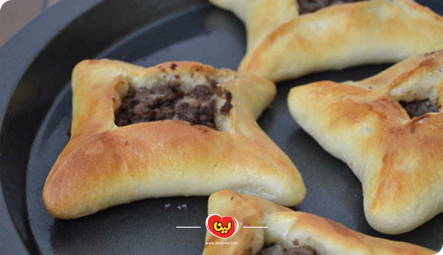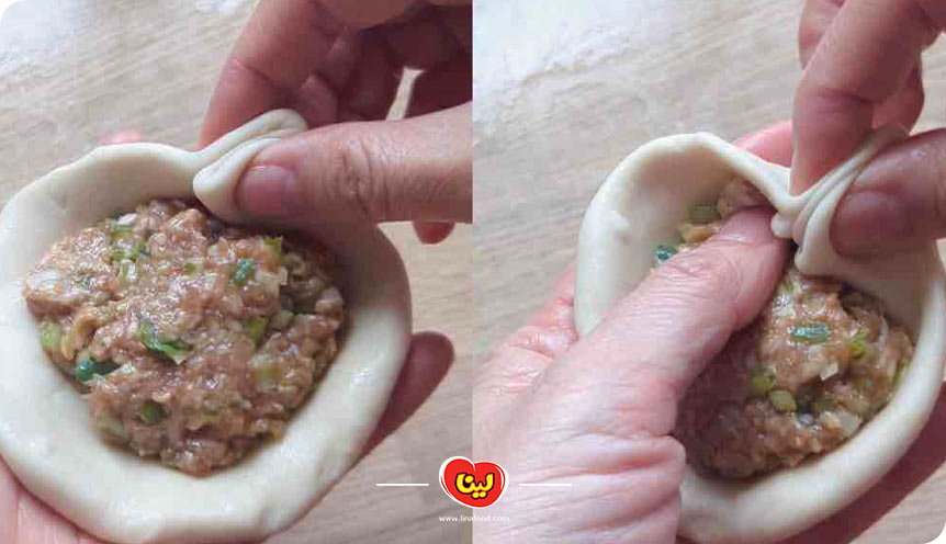 مانند تهیه لقمه تنوری، مقدار کافی از مخلوط گوشت را در وسط خمیر پهن شده قرار میدهیم و آن را از ۴ گوشه جمع میکنیم تا مواد از خمیر بیرون نریزد. این کار را برای تمامی مواد انجام میدهیم.