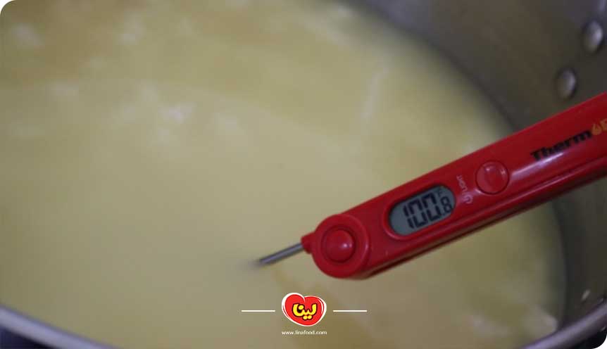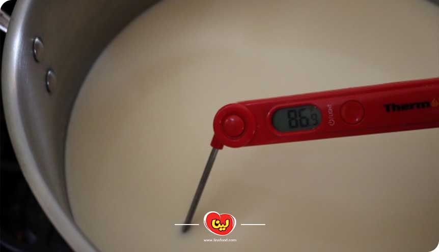 برای شروع کار، شیر را در یک قابلمه بزرگ ریخته و روی حرارت متوسط قرار میدهیم تا گرم شود و دمای آن به حدود ۳۳ درجه سانتیگراد برسد.