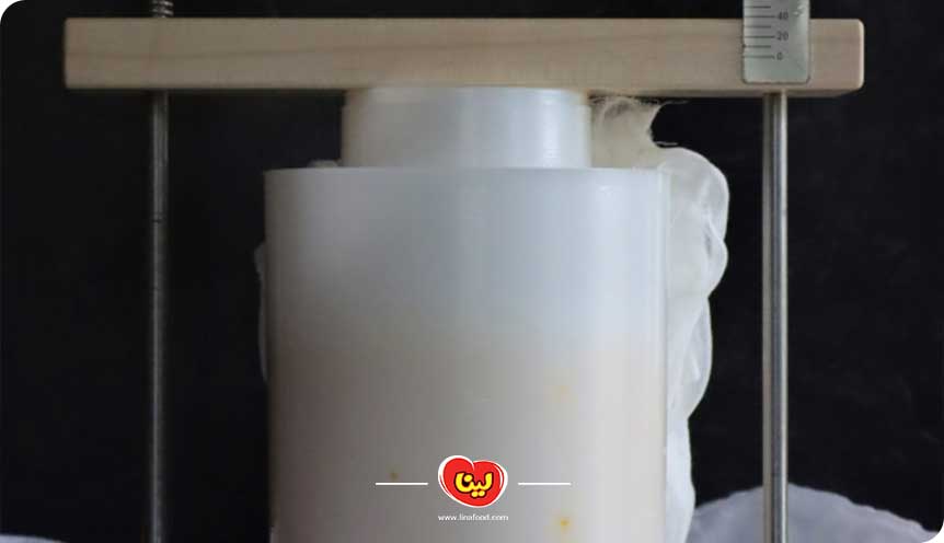 در این مرحله، مواد پنیر را در قالب ریخته و به مدت نیم ساعت وزنهای ۱۱ کیلویی روی آن قرار میدهیم تا به خوبی فشرده شوند.