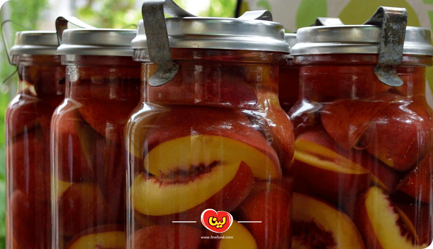 تکههای هلو را در ظرف شیشهای مناسب که از قبل شسته و استریل کردیم، به صورت مرتب میچینیم.