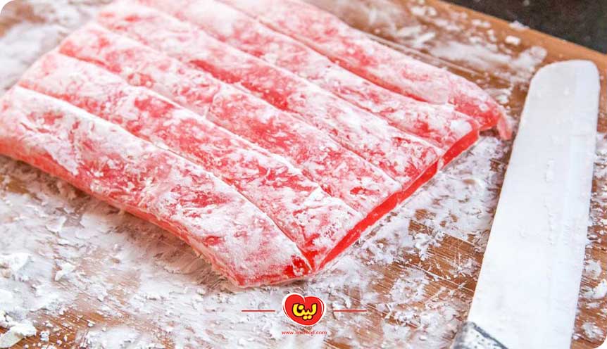 بعد از اینکه مسقطی انار خنک و منسجم شد، آن را از یخچال خارج کرده و با یک چاقو، اطراف مسقطی را از لبههای قالب جدا میکنیم و قالب را برمیگردانیم. مسقطی را بهطور کامل از آن خارج کرده در نهایت با استفاده از پودر نارگیل و مغز گردو یا پودر پسته روی آن را تزئین میکنیم.