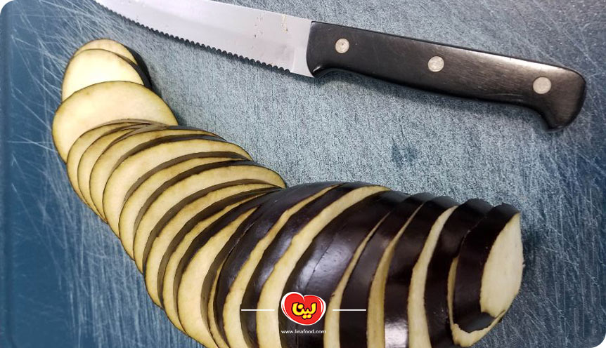 در صورت تمایل میتوانید برای تهیه این غذا بادمجانها را پوست کنده و سپس به صورت حلقهای برش بزنید.