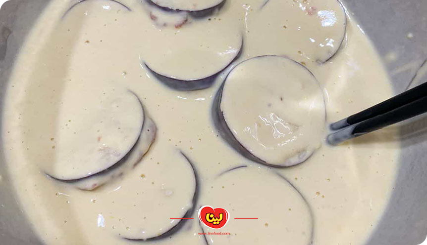 مرحله چهارم؛ آغشته کردن بادمجانها به مایه پفکی