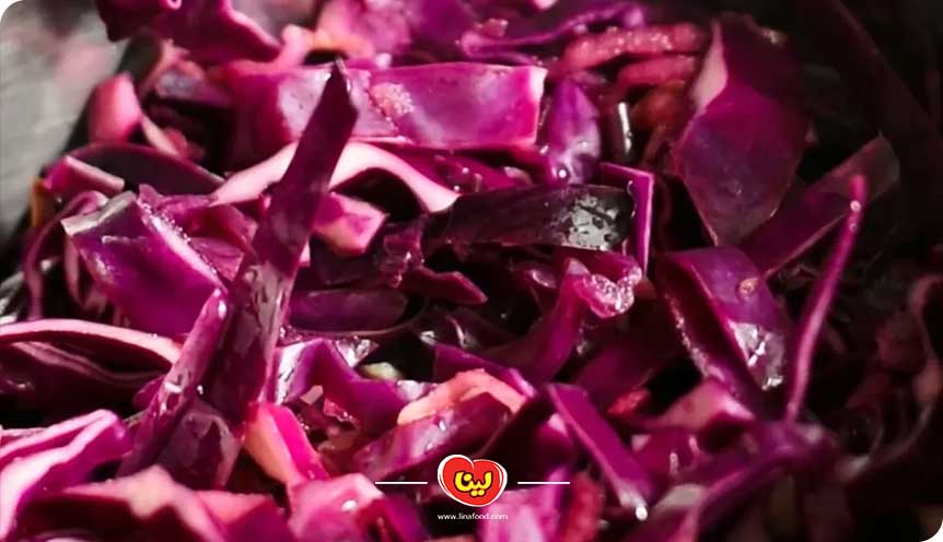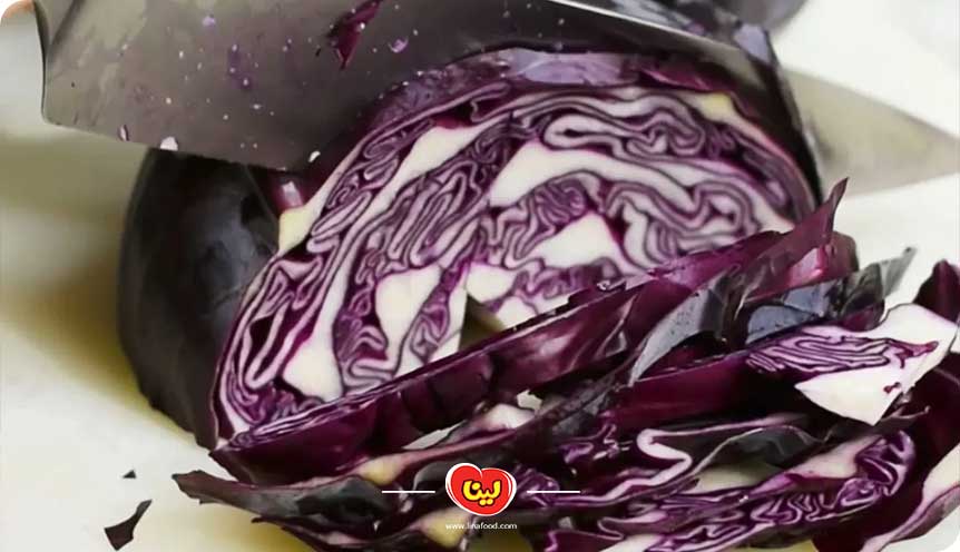 ابتدا کلم قرمز را به خوبی شسته و آبکش میکنیم تا کاملا خشک شود. سپس مانند تهیه ترشی کلم قرمز با یک چاقوی تیز، کلم را به صورت نوارهای نازک خرد میکنیم.