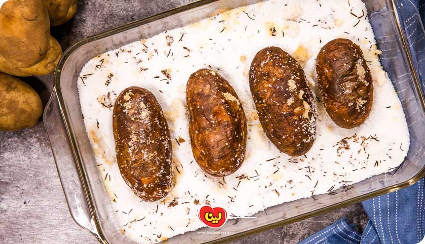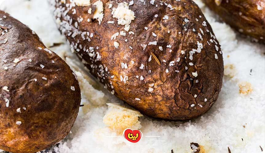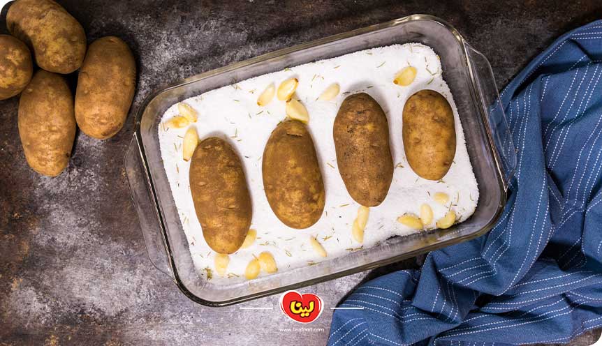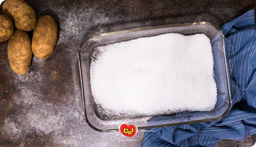 در صورت عدم دسترسی به فر میتوانید نمک را در قابلمه ریخته و سیب زمینیها را روی آن بچینید. سپس به مدت یک ساعت با حرارت ملایم بپزید.