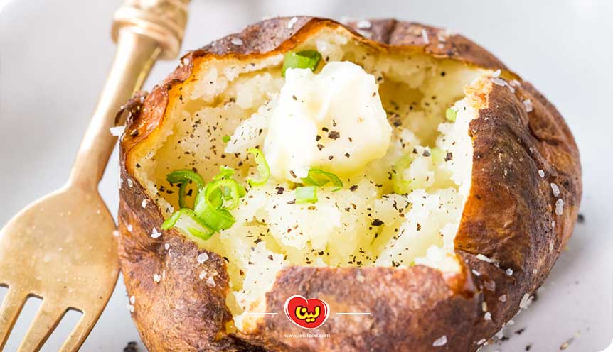 پس از گذشت مدت زمان تعیین شده و پخت کامل سیب زمینیها، آنها را از فر خارج کرده و در ظرف مناسبی قرار میدهیم تا کمی خنک شوند. سپس سیب زمینیها را از وسط برش زده و کره را روی آن قرار میدهیم تا با گرمای سیب زمینی ذوب شود و سپس سرو میکنیم.