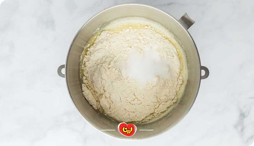 برای تهیه نان صمون ایلامی در ابتدا، آرد نان فانتزی را سه بار الک کرده و سپس به همراه نمک و مایه خمیر فوری درون یک کاسه بزرگ میریزیم و با هم ترکیب میکنیم.