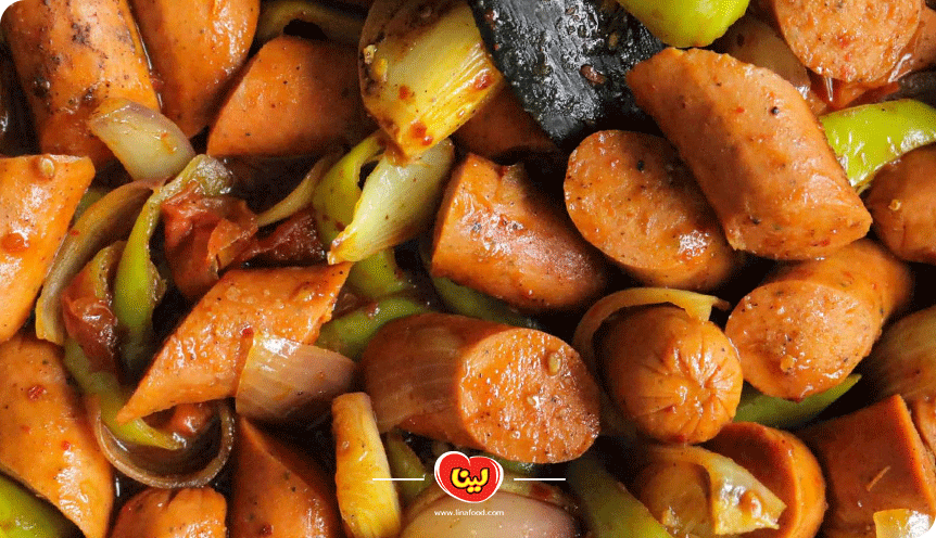 در یک تابه روغن میریزیم و پیازهای خرد شده را اضافه کرده و در روغن تفت میدهیم. سپس سوسیس را اضافه کرده و به همراه پیاز سرخ میکنیم. در ادامه رب گوجهفرنگی، آب لیمو و ادویهها را به همراه جعفری به ترکیب مواد اضافه کرده و خوب هم میزنیم تا با هم مخلوط شوند.