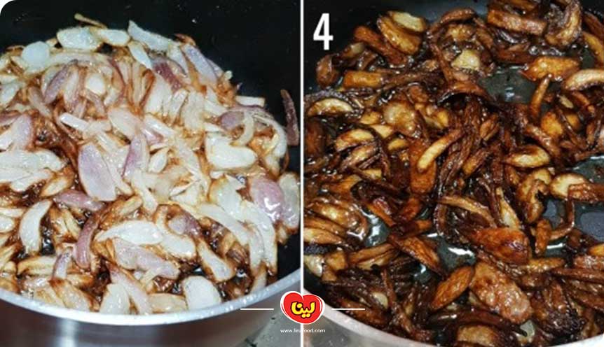 مرحله دوم؛ تفت دادن پیاز و گوشت