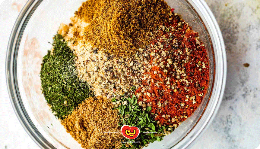 در ادامه تمامی ادویهها را در یک کاسه بزرگ ریخته و با هم ترکیب کنید. برای این کار میتوانید از یک قاشق یا همزن دستی استفاده کنید تا ادویهها به طور یکنواخت با هم مخلوط شوند.