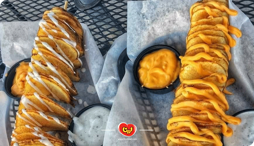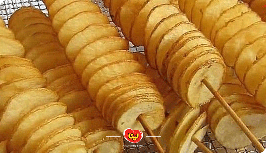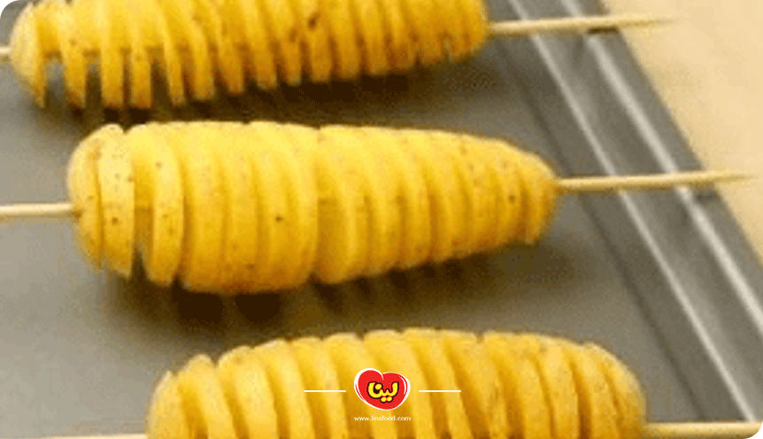 پس از سیخ کشیدن سیبزمینیها، آنها را از انتها به شکل مارپیچ برش میزنیم. سپس حلقههای برش زده شده را به آرامی از هم فاصله داده و باز میکنیم.