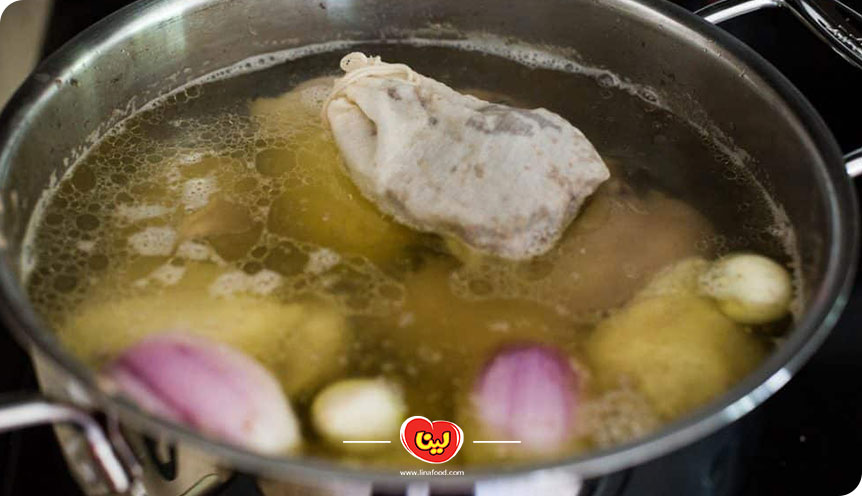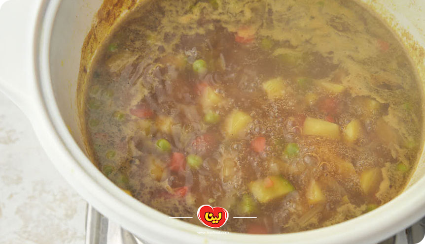 مرحله پنجم؛ افزودن آب مرغ و سبزیجات