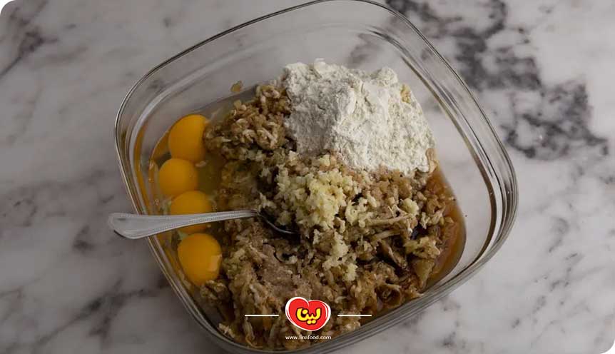 پیاز و سیر را پوست کنده و مانند بادمجانها رنده میکنیم. سپس سیر و پیاز رنده شده را به همراه بادمجان، تخم مرغ، پنیر پارمسان رنده شده، آرد، نمک و فلفل در یک ظرف مناسب با هم مخلوط کرده و خوب هم میزنیم تا ترکیب یکدستی حاصل شود.
