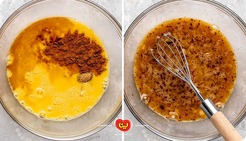 پس از اینکه شکر و تخم مرغ به خوبی با هم ترکیب شدند، عصاره وانیل و دارچین را اضافه کرده و همه مواد را با هم مخلوط میکنیم.