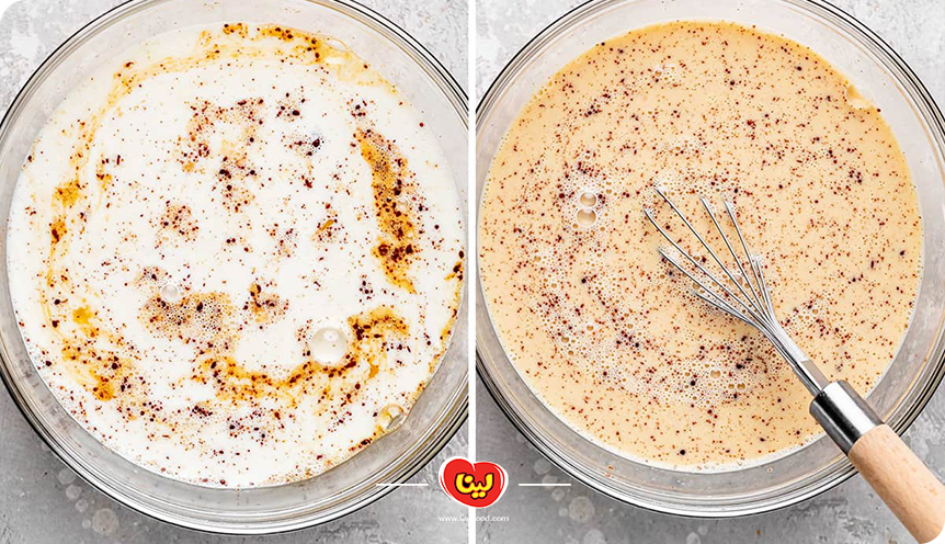 در این مرحله مانند تهیه کرپ رنگی، شیر را به آرامی به همراه نمک به مخلوط مواد قبلی اضافه کرده و همه را با هم ترکیب میکنیم تا مواد کاملا به خورد هم روند.