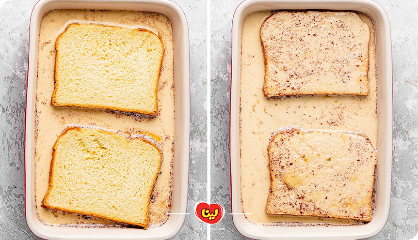 پس از ترکیب همه مواد با یکدیگر، آنها را در یک ظرف مستطیل شکل میریزیم. سپس نانهتی تست را به ترتیب درون ظرف قرار داده و به خوبی هر دو طرف نان را به مواد آغشته میکنیم.